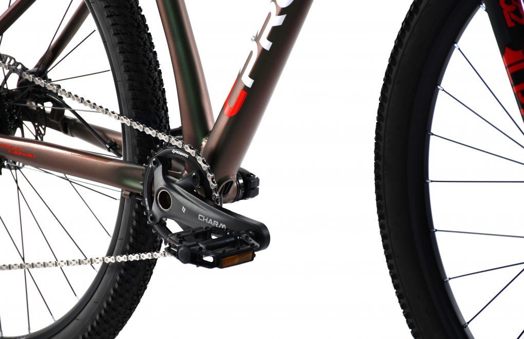 Pohon tvoria kvalitné komponenty PROWHEEL – stredový pohon CHARM-34-TT a stredové ložiská PROWHEEL DOLLOWED. Zadná prehadzovačka je SHIMANO RD-M5100, 11-rýchlostná, ovládaná pravou radiacou pákou SHIMANO SL-M5100-R.