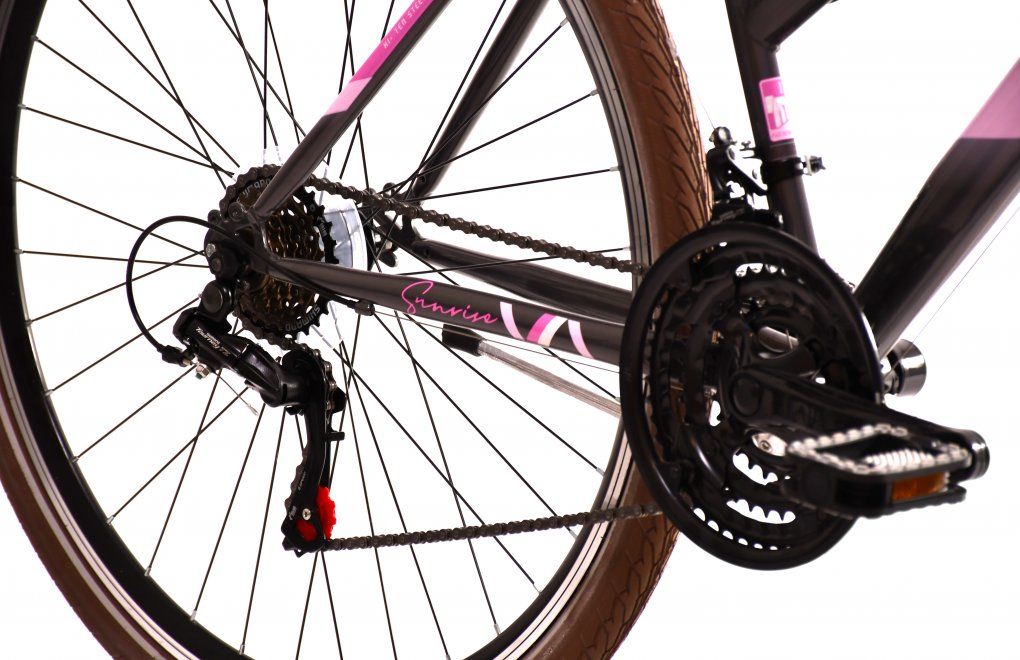 Dámsky trekový bicykel Capriolo Sunrise vás dovezie kamkoľvek po meste i do prírody, takže sa skvele hodí pre dopravu do práce alebo do školy aj na krátke či dlhé výlety. Bicykel sa pri jazde dobre vedie, lepšie drží stopu mimo terén a kladie nízky valivý odpor. Pýši sa obrími 28" kolesami a je vybavený vysoko kvalitnou prednou prehadzovačkou Shimano Tourney FD-TZ510 a zadnou prehadzovačkou Shimano Tourney SL-TZ500, ktoré vám spoločne poskytnú spoľahlivú podporu pri stúpaní. Vďaka radeniu SHIMANO SHIFT LEVER SL-RS-35 máte za každej situácie k dispozícii 18 prevodových stupňov, takže ľahko zvládnete aj veľmi prudké svahy a kopce.